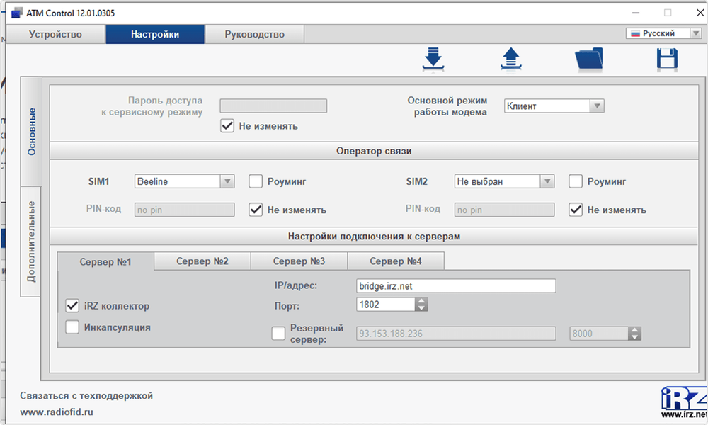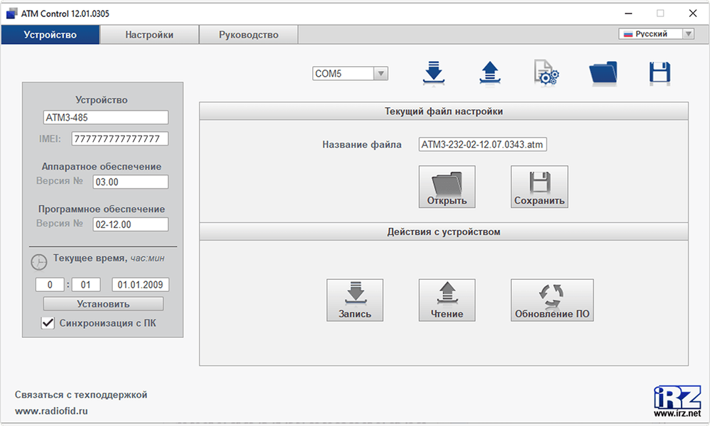 Программа настройки ATM Control предназначена для локальной настройки модемов iRZ семейства ATM, а также обновления их встроенного программного обеспечения. Программа ATM Control может быть установлена как в диспетчерском центре, так и на любом персональном компьютере, операционная система которого поддерживает работу программы.