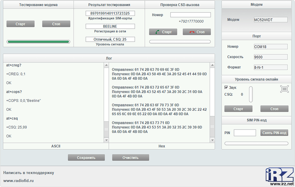 Перед использованием программы не требуется вводить каких-либо настроек в модем. Программа автоматически перебирает возможные скорости и форматы данных. Процесс тестировании, настройки отображается в виде лога. Который, в случае необходимости, можно сохранить и переслать к нам в службу поддержки..